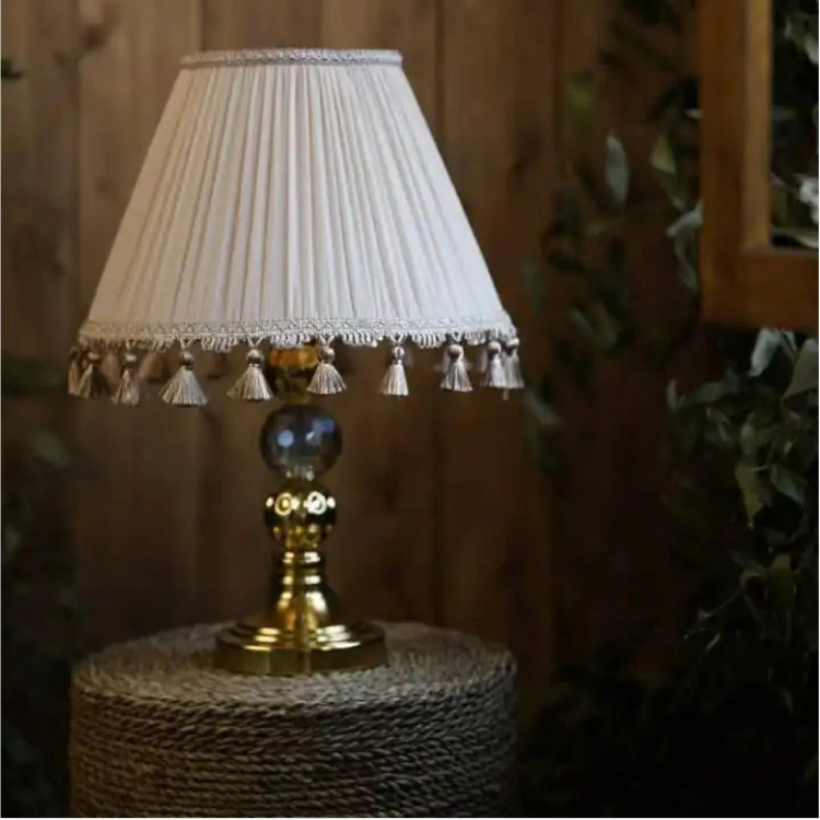 ✨ نور ملایم، حس نوستالژیک این چراغ رومیزی با طراحی کلاسیک و جزئیات ظریف، فضایی گرم و دلپذیر برای منزل یا دفتر شما خلق میکند. ترکیب پایه طلایی براق، گوی شیشهای وسط و آباژور چیندار با منگولههای تزئینی، حس لوکس و سنتی را در کنار عملکردی کاربردی ارائه میدهد.